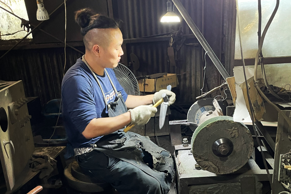„Hi-zukuri“ ist eine traditionelle japanische Schmiedetechnik, bei der Stahl (Hagane) über Holzkohlefeuer erhitzt und anschließend von Hand mit dem Hammer geformt wird.